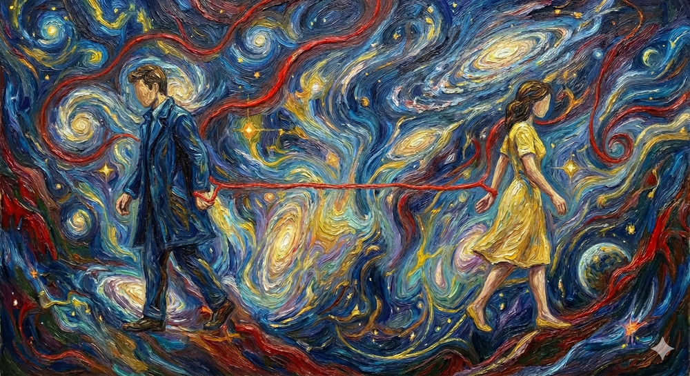 The Red String Of Fate"يُحكى أن الأرواح التي كُتب لها التلاقي مربوطةٌ بخيطٍ أحمرٍ سرمدي. قد يمتد عبر المجرات، ويتشابك مع النجوم، لكنه لا ينقطع أبداً.